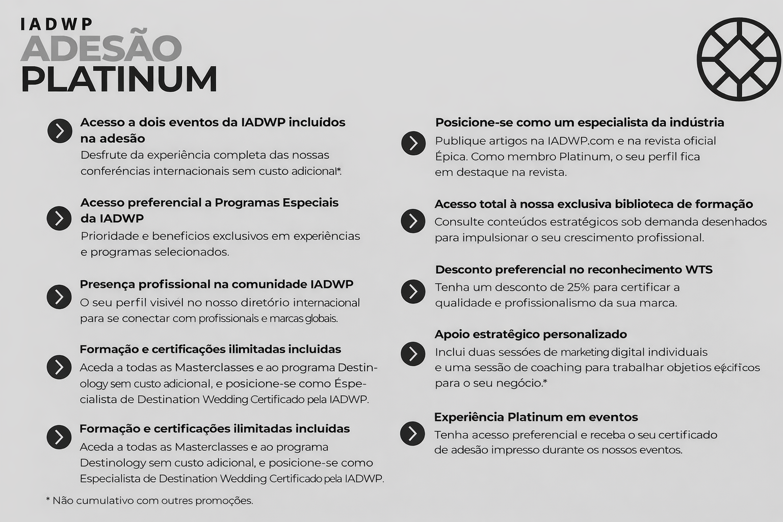 Se participa ativamente nos eventos da IADWP ou tenciona fazê-lo ao longo do ano, o Platinum maximiza o seu investimento desde o primeiro momento. Ao incluir acesso a eventos e benefícios premium, esta modalidade de adesão elimina custos adicionais e proporciona uma experiência completa: maior visibilidade, melhores localizações, acesso prioritário e vantagens pensadas para profissionais que levam a sério o seu crescimento dentro da indústria.