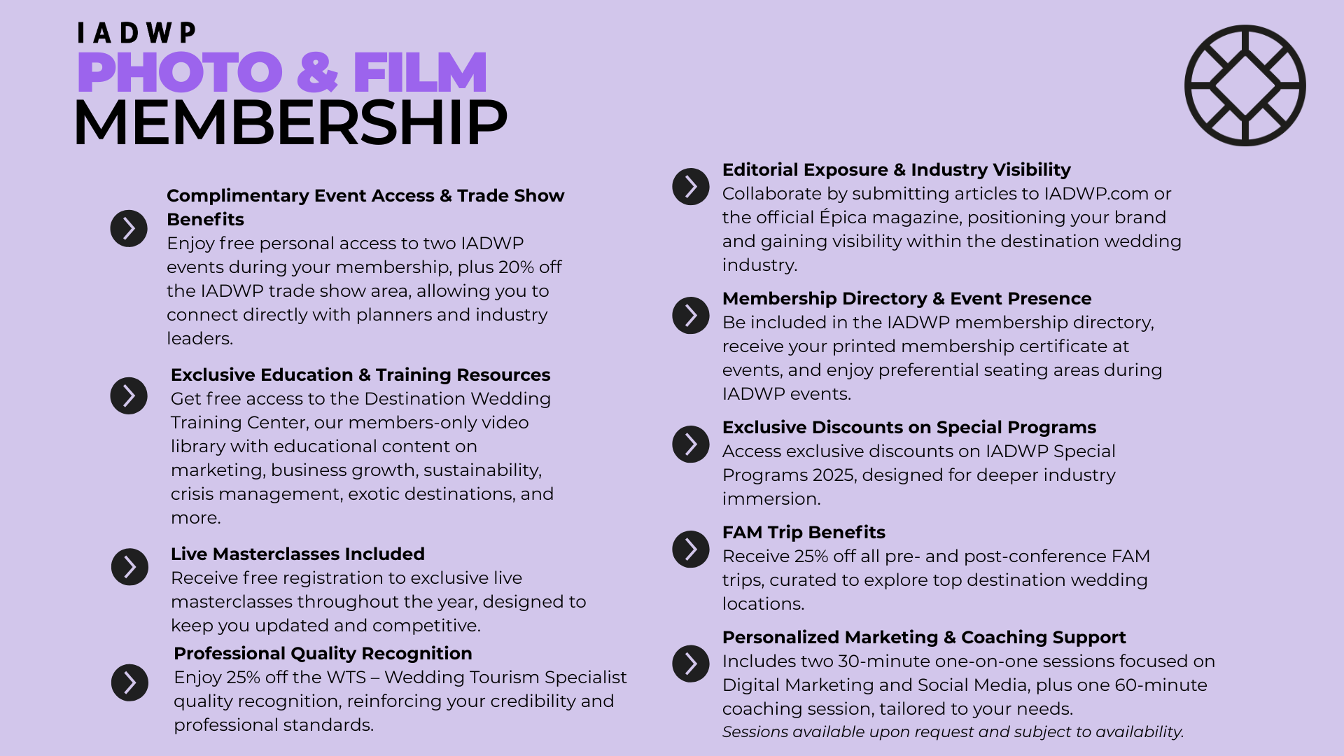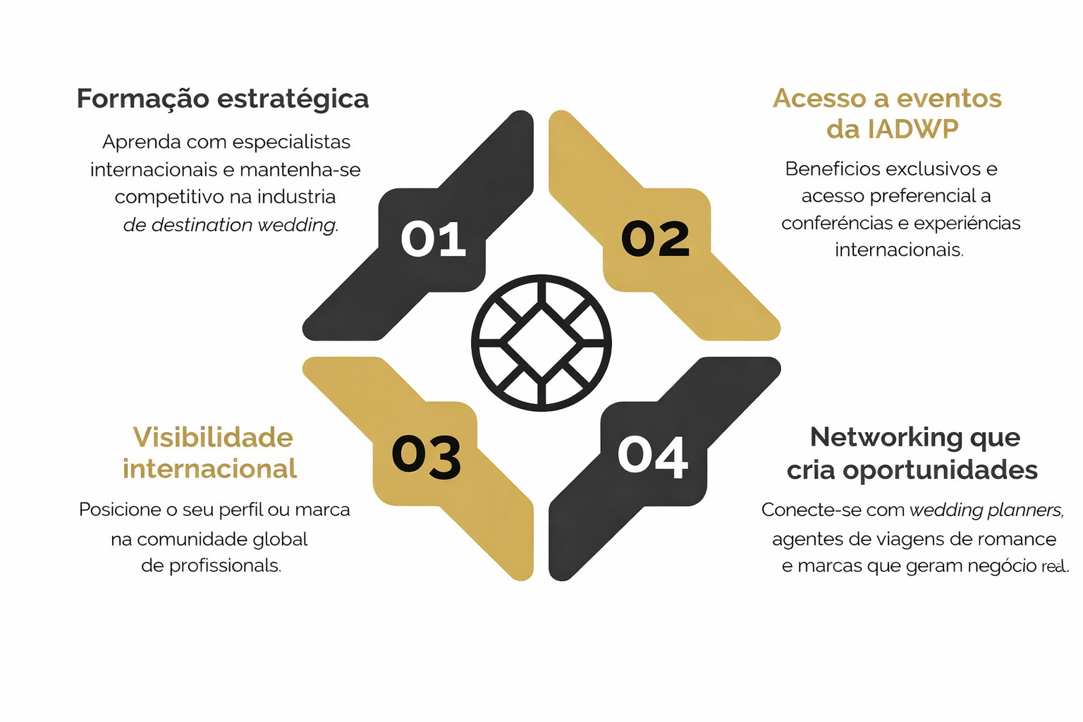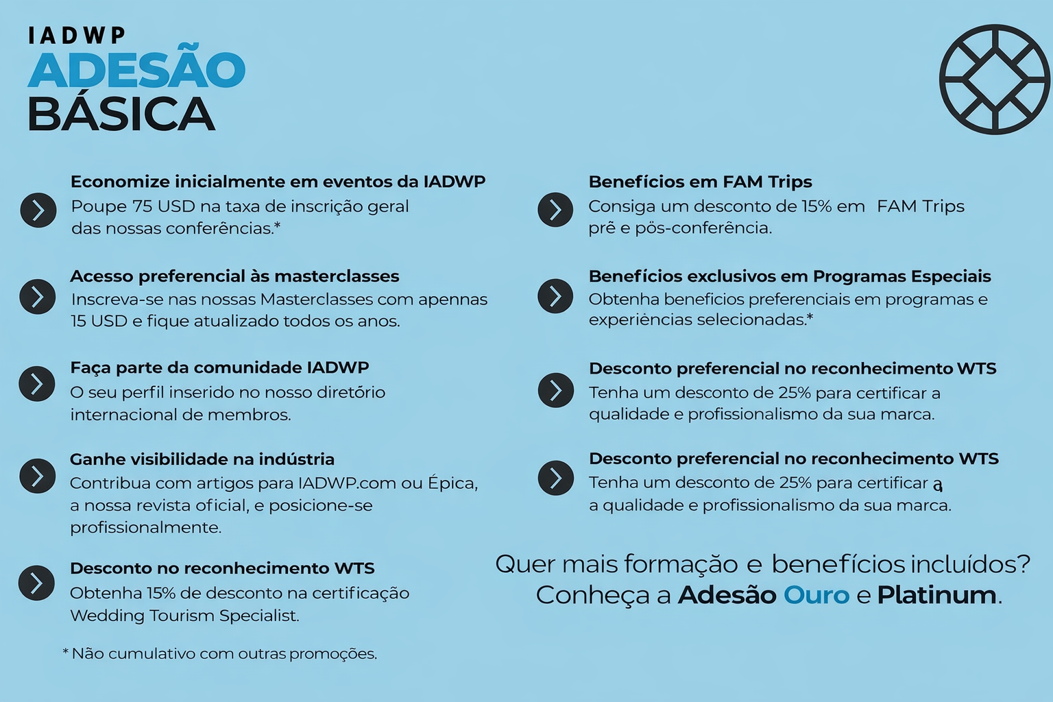 Uma forma acessível de se juntar à IADWP, alargar a sua visão da indústria de destination weddings e começar a abrir portas a oportunidades internacionais, enquanto desenvolve o seu perfil profissional dentro de uma comunidade global.