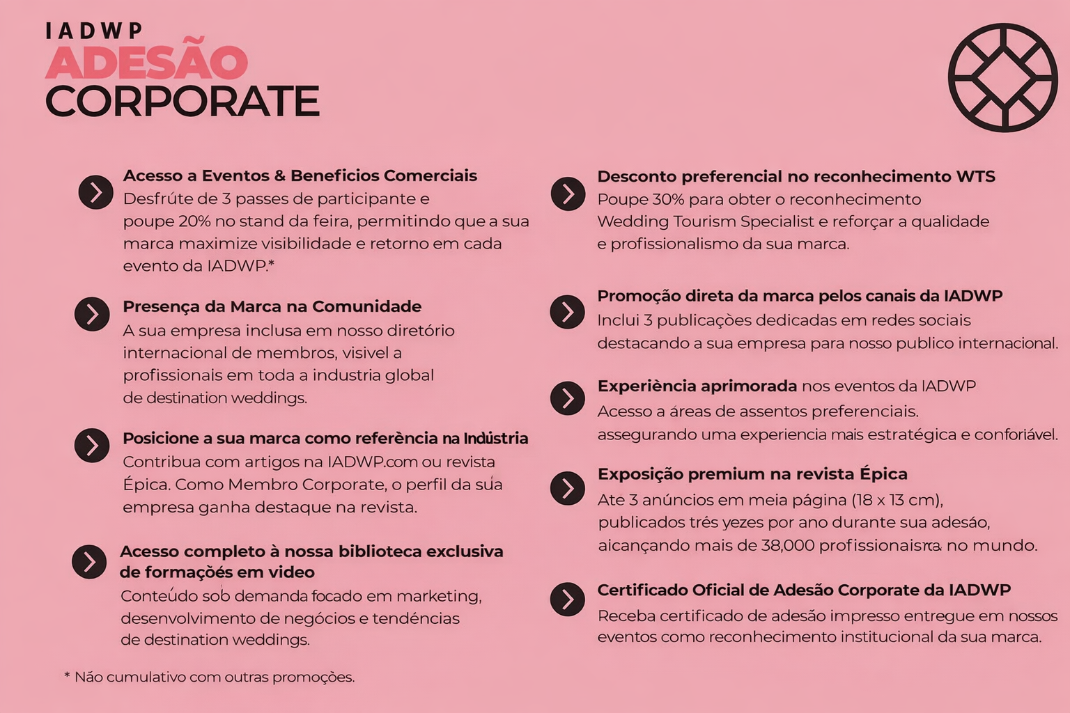 A Adesão Corporativa da IADWP permite que a sua marca se torne uma parte ativa do ecossistema de destination weddings, ligando-se diretamente a planners e consultores que geram negócio real. Para além da visibilidade, esta adesão foi pensada para marcas que procuram um posicionamento estratégico, uma presença constante ao longo do ano e oportunidades de relacionamento que vão além de um único evento. O Corporate é ideal se o seu objetivo for construir reputação, gerar confiança e manter uma presença sólida dentro da indústria.