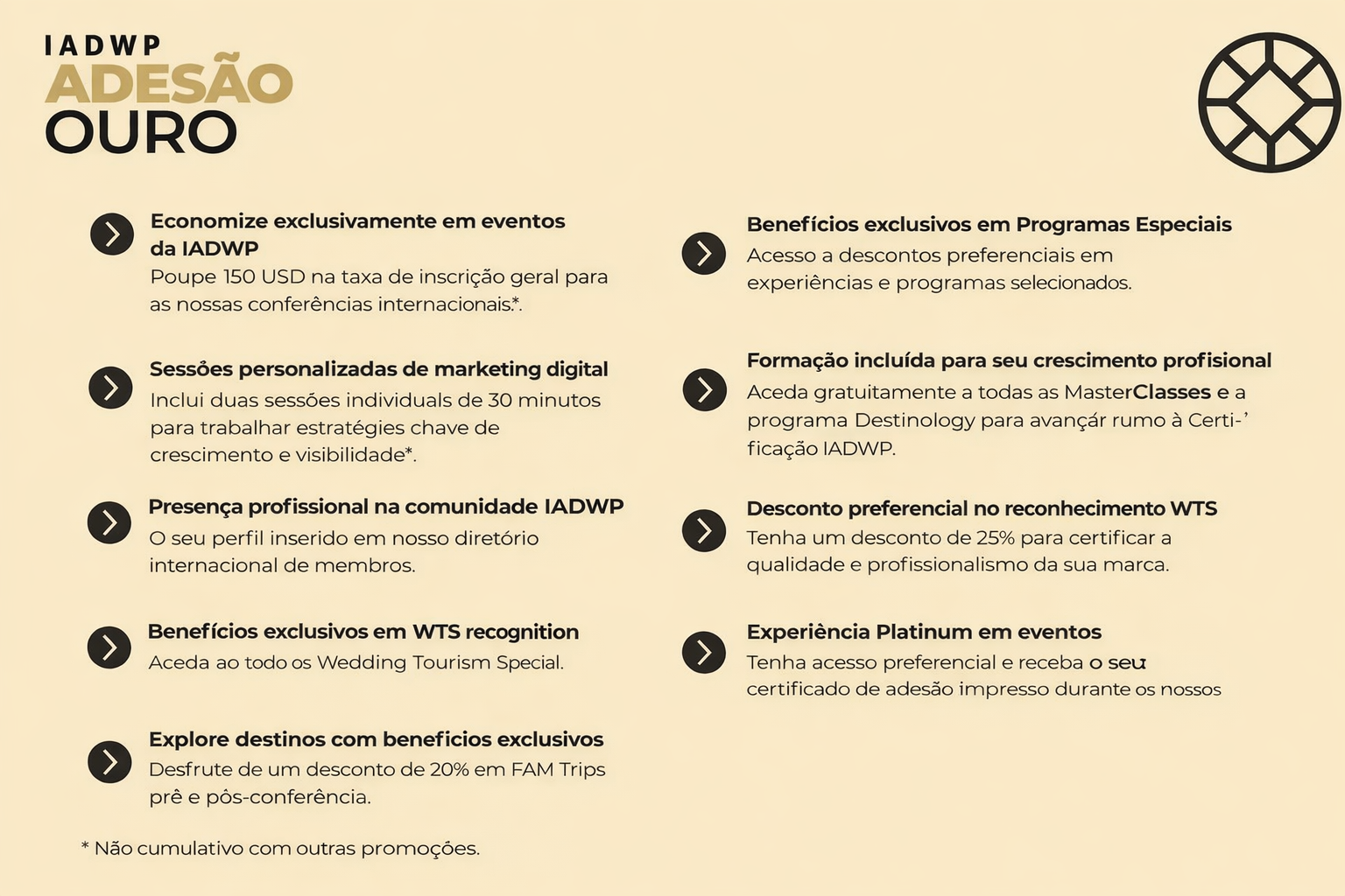 O Gold foi concebido para profissionais que pretendem investir de forma inteligente no seu crescimento, com acesso a formação contínua, benefícios exclusivos e ferramentas que reforçam a sua presença na indústria de destination weddings.